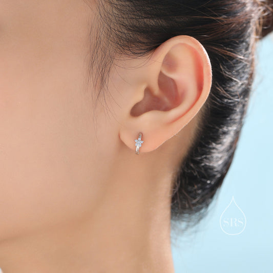 Opal Blue CZ Flower Huggie Hoop in Sterling Silver, Silver or Gold, Delicate Flower CZ Hoops, Tiny Flower Hoops, Tiny CZ Hoops