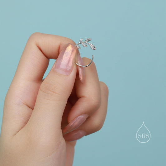 Sterling Silver Dainty Leaf Open Hoops, Delicate Olive Leaf Threader Hoops, Olive Branch Thread Through Hoops, Large Leaf Hoops