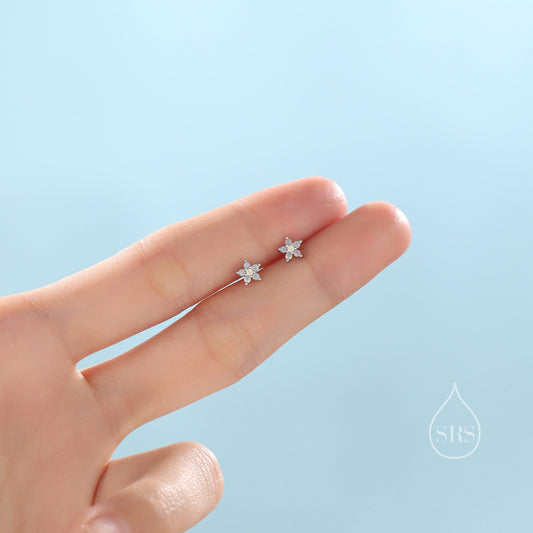 Tiny Opal Blue Forget-me-not CZ Stud Earrings in Sterling Silver, Silver or Gold or Rose Gold, Clear and Milky Blue CZ Flower Stud Earrings