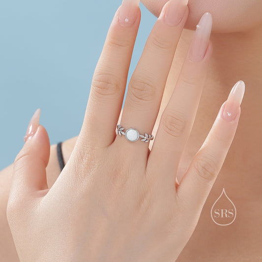White Opal Olive Leaf Ring in Sterling Silver, Adjustable Olive Leaf Ring, Botanical Ring, Leaf Ring with Lab Opal, Simulated Opal Ring