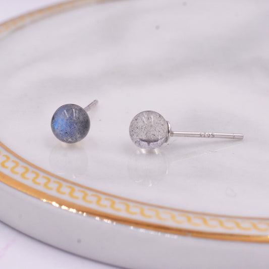 Grey Labradorite Gemstone Stud Earrings, Simple Ball Earrings, Sterling Silver Posts, Sphere Geometric Minimalist Design