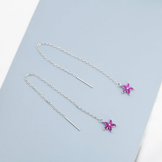 Ruby Red CZ Flower Threader Earrings in Sterling Silver, Silver or Gold, Forget-me-not Floral Ear Threaders, Sparkly CZ Threaders