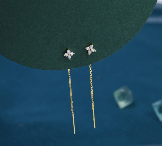 Hydrangea Flower CZ Threader Earrings in Sterling Silver, Silver or Gold, Four Dot Crystal Ear Threaders, Flower CZ Earrings