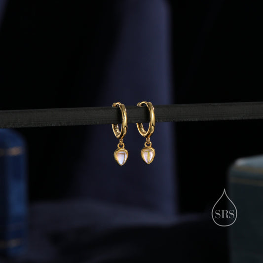 Moonstone Droplet Huggie Hoop Earrings in Sterling Silver, Simulated Moonstone Hoops, Silver or Gold, Minimal Lab Moonstone Earrings