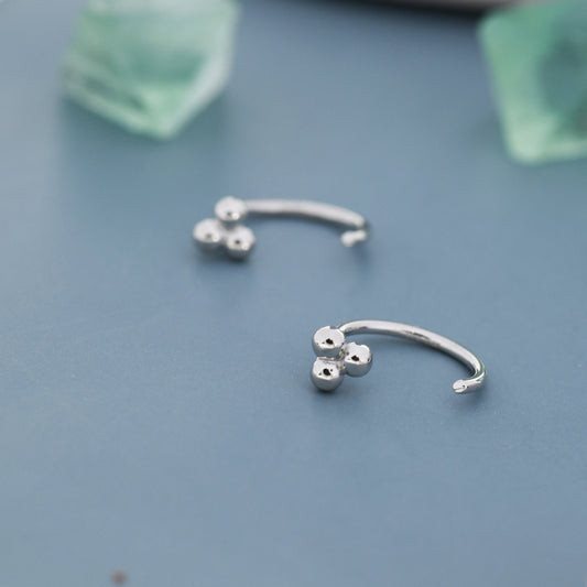 Tiny Three Ball Huggie Hoop Earrings in Sterling Silver, Three Ball Cluster Earrings, Open Hoops, Pull-Through Threader Earrings,