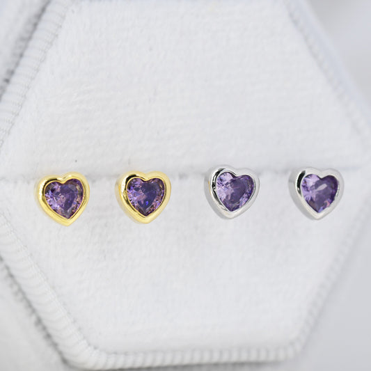 Tiny Amethyst Purple CZ Heart Stud Earrings in Sterling Silver, Silver or Gold, Purple Crystal Heart Earrings, Stacking Earrings