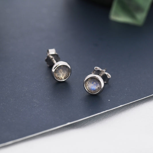 Sterling Silver Rose Cut Labradorite Stud Earrings, 3mm or 4mm, Genuine Labradorite Gemstone Stud, Bezel, Minimalist Style