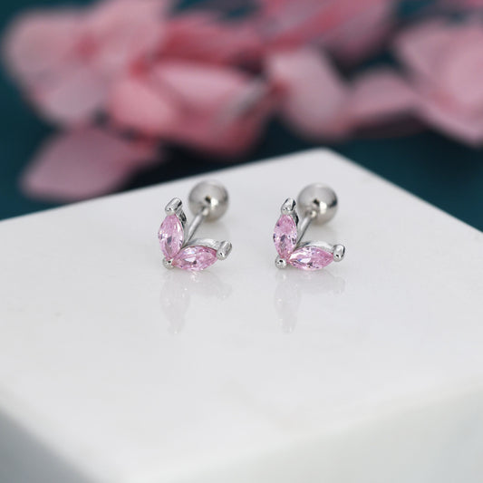 Sterling Silver Rose Pink CZ Marquise Leaf Duo Barbell Earrings, Gold or Silver, Marquise Fan Screwback Earrings, Two Marquise