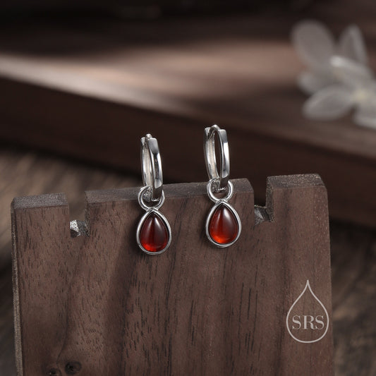 Sterling Silver Genuine Garnet Droplet Hoop Earrings, Detachable Pear Shape Garnet Dangle Hoop Earrings, Interchangeable Natural Red Garnet