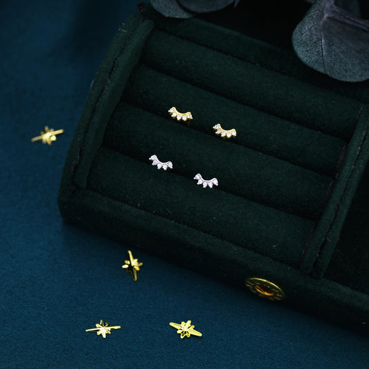 Extra Tiny Curved CZ Bar Stud Earrings in Sterling Silver, Silver or Gold, Geometric Tiny Three Star CZ Earrings, Stacking Earrings