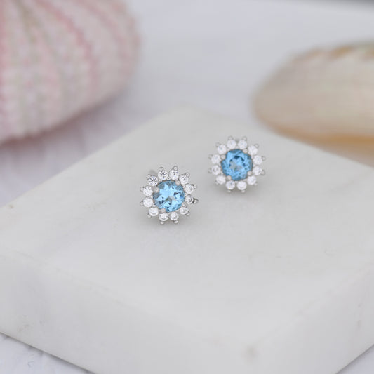 Genuine Swiss Blue Topaz Crystal Stud Earrings in Sterling Silver, Natural Blue Topaz Halo Stud Earrings