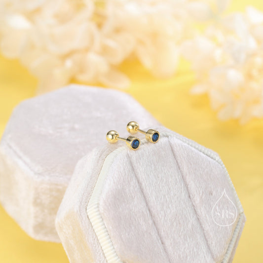 Sterling Silver Bezel Set Sapphire Blue CZ Crystal Screw Back Earrings, 3mm CZ Piercing Jewellery, Brilliant Cut Blue CZ Barbell Earrings