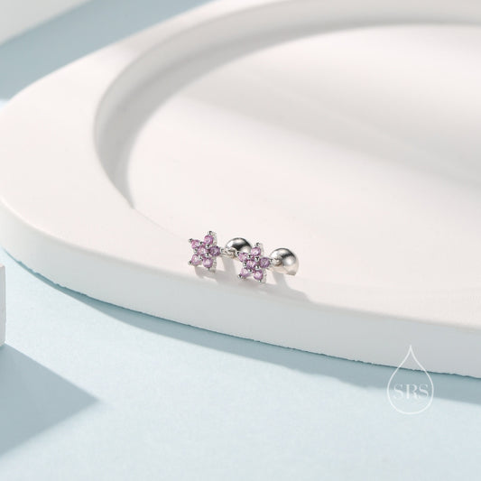 Pink Flower CZ Screw Back Earrings in Sterling Silver, Forget Me Not Floral CZ Earrings, Silver or Gold, Flower CZ Earrings