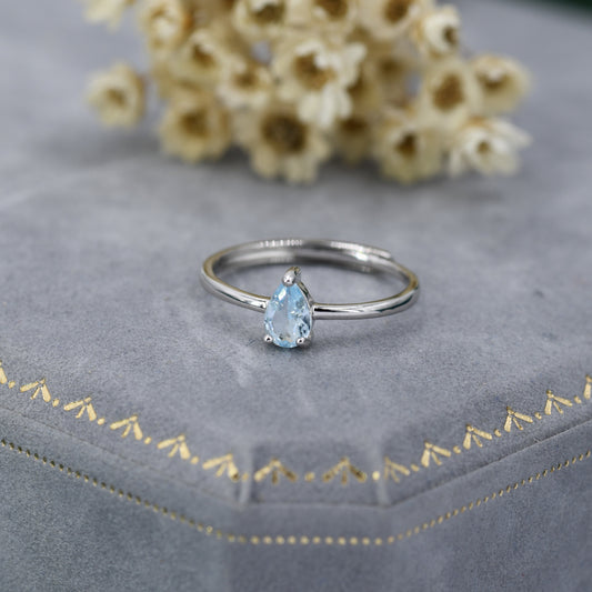 Natural Blue Topaz Droplet Ring in Sterling Silver, 4x6mm, Prong Set Pear Cut, Adjustable Size, Genuine Topaz Ring