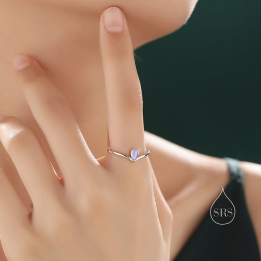 Minimalist Moonstone Droplet V Ring in Sterling Silver, Adjustable Size Prong Set Lab Moonstone Ring, Chevron Ring, Simulated Moonstone Ring