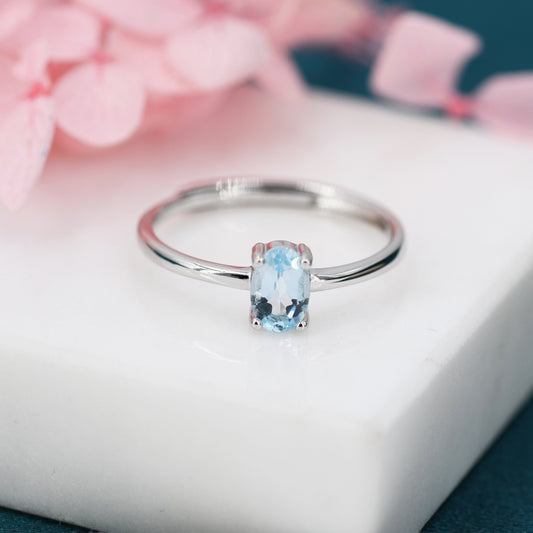 Natural Blue Topaz Oval Ring in Sterling Silver, 4x6mm, Prong Set Oval Cut, Adjustable Size, Genuine Topaz Ring