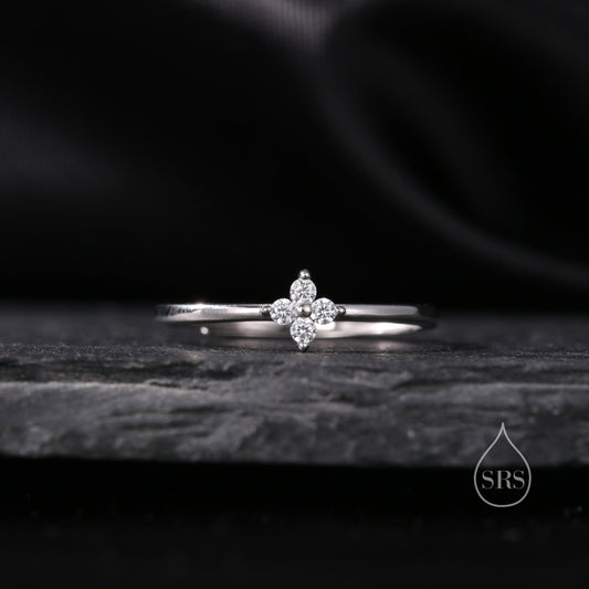 Hydrangea CZ Flower Minimalist Ring in Sterling Silver, Four Crystal Flower Ring, Tiny CZ Ring, Adjustable Size