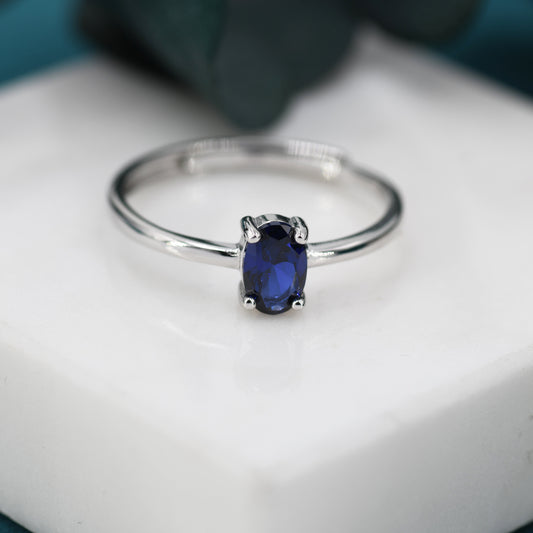 Created Blue Sapphire Oval Ring in Sterling Silver, 4x6mm, Prong Set Oval Cut, Adjustable Size, Blue Corundum Ring, September Birthstone