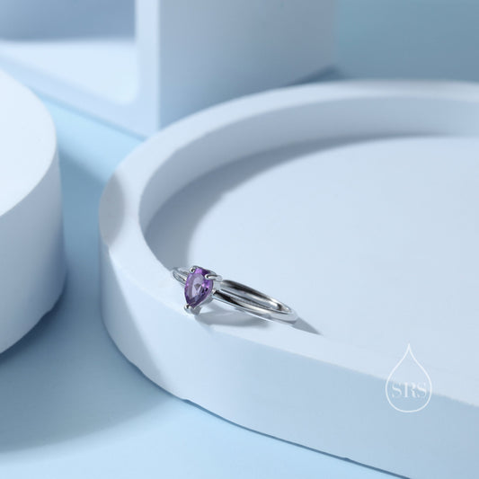 Natural Amethyst Droplet Ring in Sterling Silver, 4x6mm, Prong Set Pear Cut, Adjustable Size, Genuine Amethyst Ring, February Birthstone