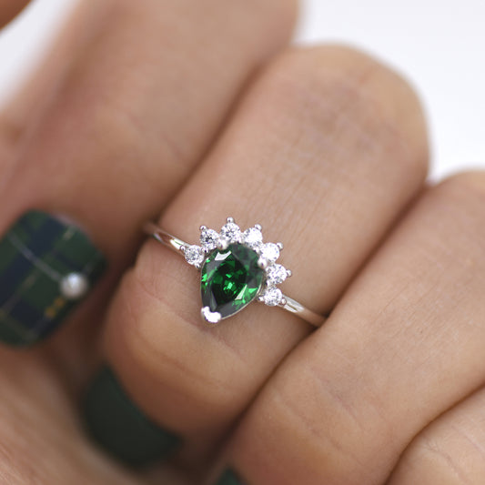 Pear Cut Emerald Green CZ Crown Ring in Sterling Silver, May Birthstone, Lab Emerald Ring, Vintage Inspired Design, US 5 - 8