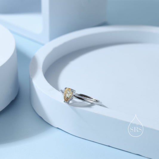 Natural Citrine Droplet Ring in Sterling Silver, 4x6mm, Prong Set Pear Cut, Adjustable Size, Genuine Citrine Ring, November Birthstone