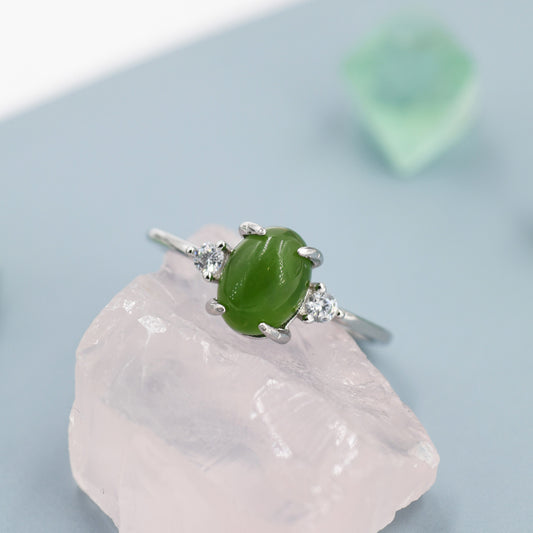 Genuine Oval Jade Stone Halo Ring in Sterling Silver, US 5 - 8, Natural Oval Jade Gemstone Ring, Crystal Flower Ring