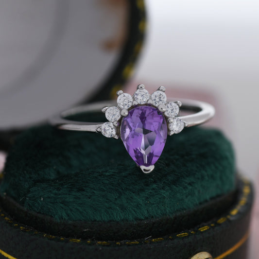 Genuine Pear Cut Amethyst Crown Ring in Sterling Silver, Natural Amethyst Crystal Ring, Vintage Inspired Design, US 5 - 8