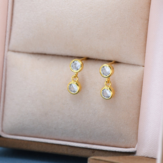 Double CZ Dangle Stud Earrings in Sterling Silver, Silver or Gold, Two CZ Bezel Earrings, Solid Silver Crystal Earrings