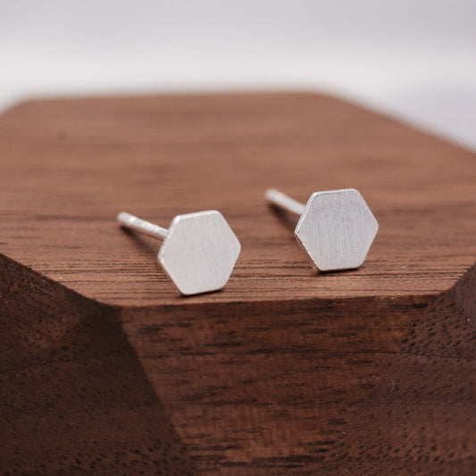 Sterling Silver Minimalist Hexagon Geometric Stud Earrings - Textured Finish - Dainty and Discreet
