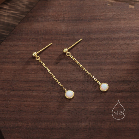 White Opal with Chain Dangle Stud Earrings in Sterling Silver, Silver or Gold, Lab Opal Earrings, Minimal Dangling Fire Opal Earrings