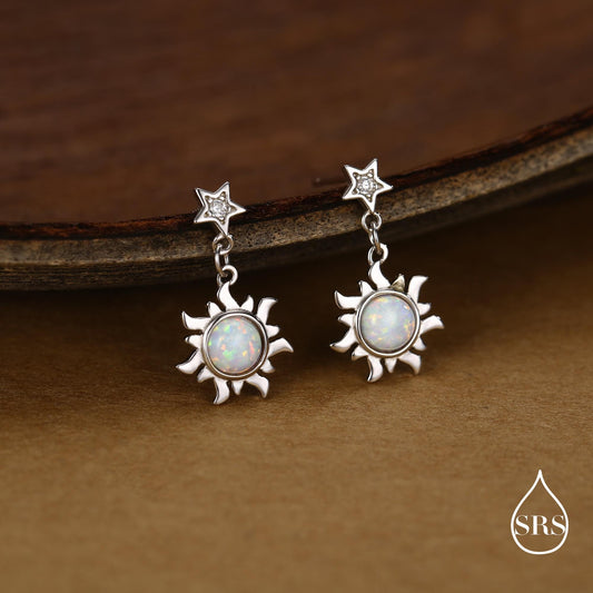 White Opal Sun and Star Dangle Stud Earrings in Sterling Silver, Silver or Gold, Star and Sun Lab Opal Celestial Earring