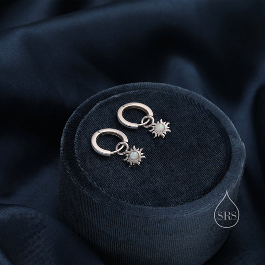 White Opal Sun Dangle Huggie Hoop Earrings in Sterling Silver, Silver or Gold, Sun Earrings, Celestial Earrings, Detachable Fire Opal Sun