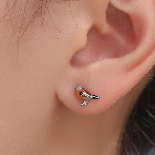 Hand Painted Robin Bird Stud Earrings in Sterling Silver, Dainty British Bird Earrings, Nature Inspired Animal Earrings