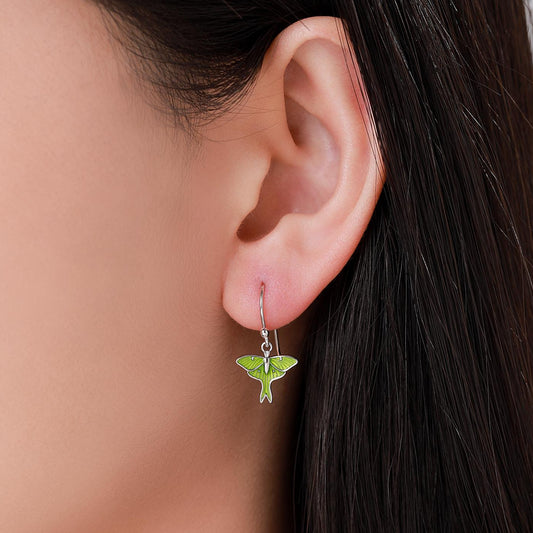 Lunar Moth Enamel Drop Hook Earrings in Sterling Silver, Green Enamel Butterfly Earrings, Insect Earrings, Nature-Inspired Animal Earrings