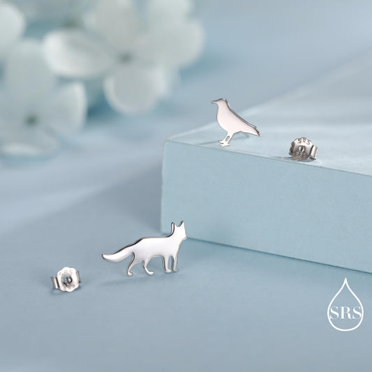 Mismatched Fox and Crow Stud Earrings in Sterling Silver, Cute Fun Quirky, Silver or Gold Finish, Gift for Her, Animal Lover