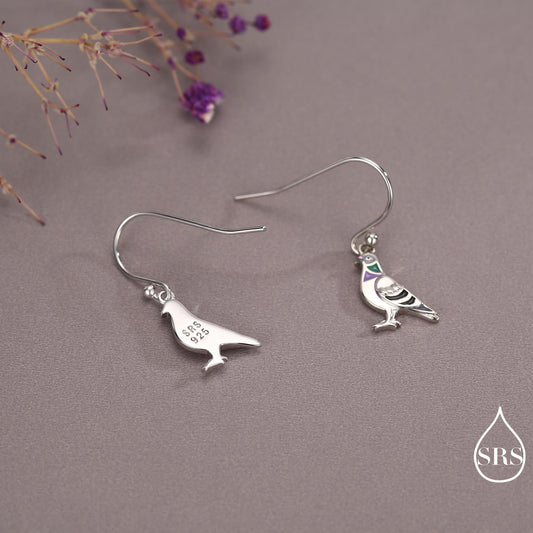 Sterling Silver Pigeon Bird Drop Hook Earrings, Enamel Coated Pigeon Dangle Earrings, Nature Inspired Animal Earrings