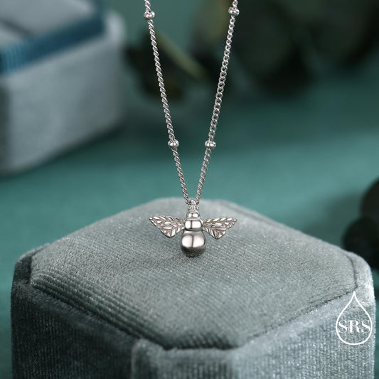 Tiny Bumble Bee Pendant Necklace in Sterling Silver, Silver or Gold, Beaded Chain, Satellite Chain, Nature Inspired Animal Jewellery