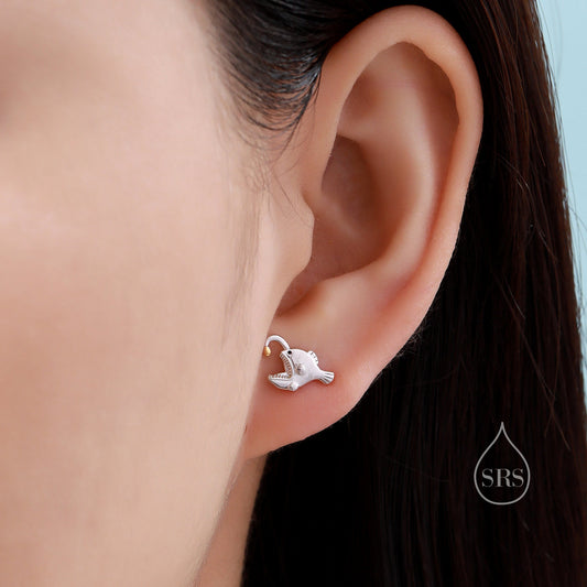 Anglerfish Stud Earrings in Sterling Silver, Anglerfish Earrings, Fish Earrings, Silver Fish Stud, Cute and Quirky Animal Earrings