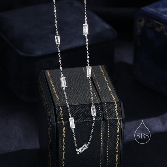Baguette CZ Satellite Necklace in Sterling Silver, Silver or Gold, Sterling Silver Clear CZ Baguette Chain Necklace