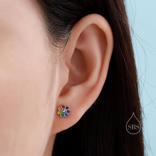 Enamel Smiling Flower Stud Earrings in Sterling Silver, Silver Rainbow Flower Earrings, Multi Colour Flower Stud in Sterling Silver