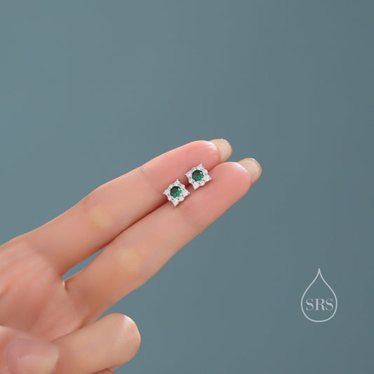Tiny Emerald Green CZ Halo Stud Earrings in Sterling Silver, Silver or Gold, Vintage Inspired, Tiny CZ Stud Earrings, May Birthstone