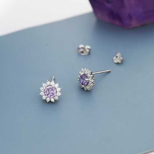 Amethyst Purple CZ Halo Stud Earrings in Sterling Silver, Silver or Gold, February Birthstone Earrings, Flower CZ Earrings