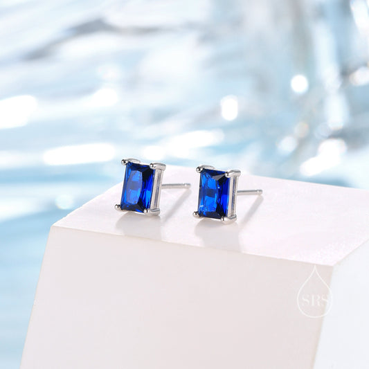 Emerald Cut Sapphire Blue CZ Stud Earrings in Sterling Silver, Rectangular Cut Crystal Earrings, September Birthstone
