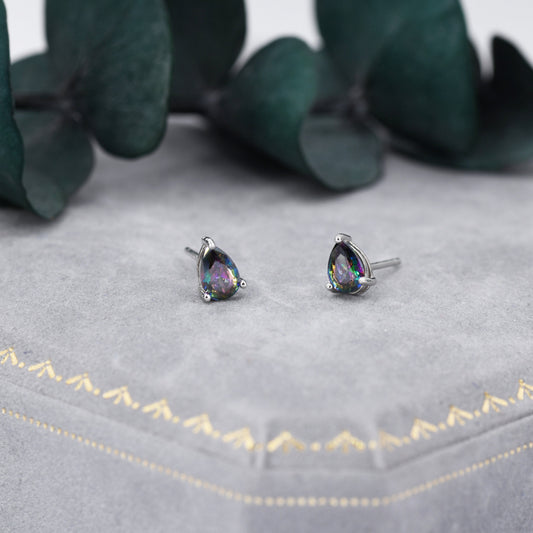 Sterling Silver Mystic Black Droplet Stud Earrings, Pear Cut Aurora Black Earrings, Mystic Topaz Birthstone CZ Earrings