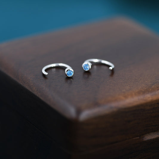 2mm Aquamarine Blue CZ Huggie Hoop Earrings in Sterling Silver, Half Hoop, Open Hoop, Pull Through, Dainty Earrings, March Birthstone