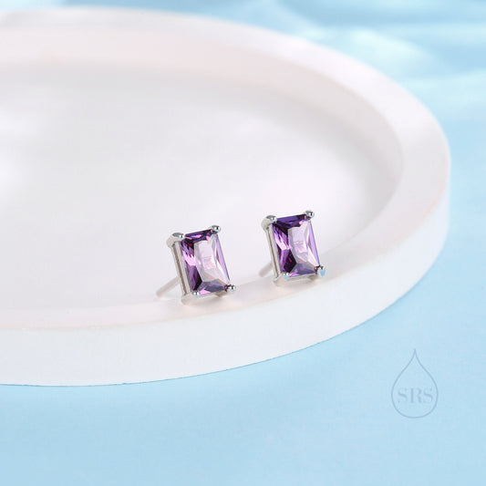 Emerald Cut Amethyst Purple CZ Stud Earrings in Sterling Silver, Rectangular Cut Crystal Earrings, February Birthstone