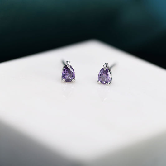 Extra Tiny Amethyst Purple Droplet CZ Stud Earrings in Sterling Silver, Tiny Pear Cut CZ Stud Earrings, Silver or Gold, February Birthstone