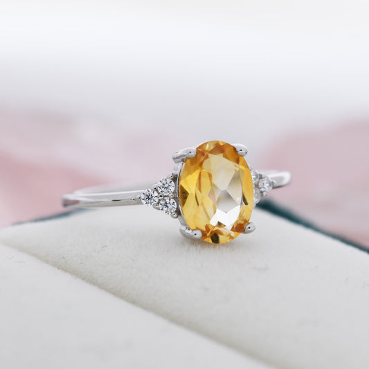 Genuine Citrine Oval Ring in Sterling Silver, Natural Citrine Ring, Three CZ, November Birthstone, Vintage Inspired Design, US 5 - 8