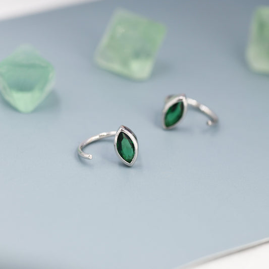 Marquise Emerald Green CZ Huggie Hoops in Sterling Silver, Marquise Crystal Open Threader Earrings, Half Hoops, May Birthstone