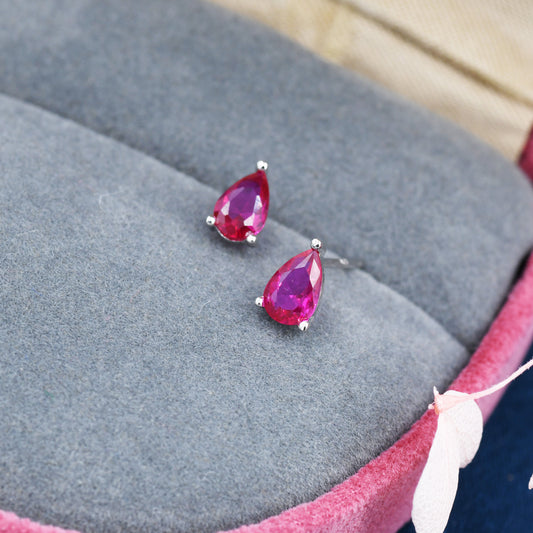 Sterling Silver Ruby Pink Droplet Earrings, Pear Cut Ruby Earrings, July Birthstone CZ Earrings, Silver or Gold